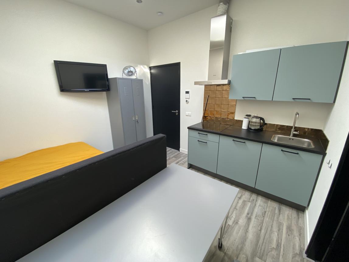 Op de eerste verdieping ligt deze mooie, net opgeleverde studio met badkamer met douche. De studio wordt gemeubileerd opgeleverd. Prijs is inclusief G/W/E, t.v. en internet.